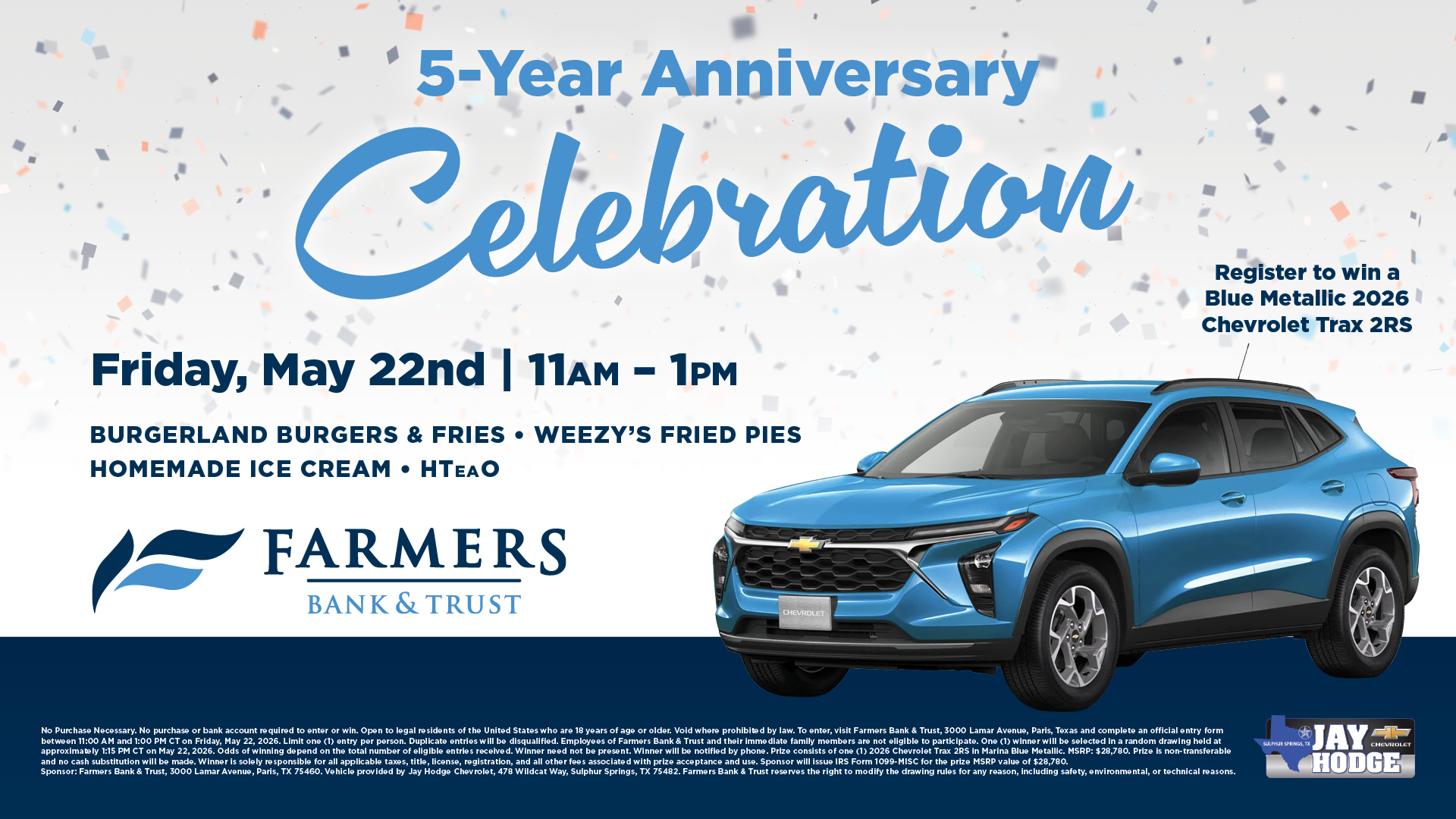Sponsor: Farmers Bank & Trust, 3000 Lamar Avenue, Paris, TX 75460. Vehicle provided by Jay Hodge Chevrolet, 478 Wildcat Way, Sulphur Springs, TX 75482. Farmers Bank & Trust reserves the right to modify the drawing rules for any reason, including safety, environmental, or technical reasons.